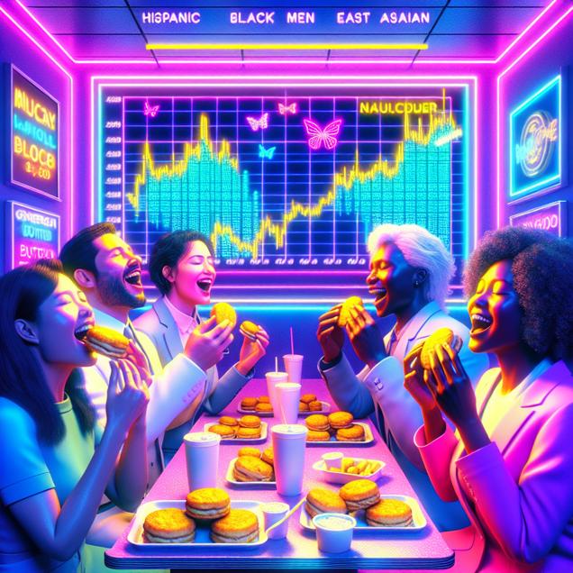 Prompt: Using the style of Vaporwave, I would envision a vibrant and nostalgic scene. In a visually dazzling and retro-futuristic McDonald's restaurant, patrons are depicted enjoying golden, buttery biscuits in a dreamy, pastel-colored atmosphere. The setting exudes a nostalgic charm with hues of electric pinks, purples, and blues, combined with elements reminiscent of 80s and 90s aesthetics. The customers, their faces filled with contentment, glow with a soft neon aura as they relish each delectable bite. Meanwhile, a stylized representation of the McDonald's stock market ticker is visible in the background, pulsating with iridescent neon lights and symbols of financial success. The entire scene is imbued with a sense of whimsical euphoria and retro-futuristic delight, capturing the essence of the buttery, flaky, and joyous experience. The depiction should include only scenes, people, and objects, it should not include text or speech bubbles.