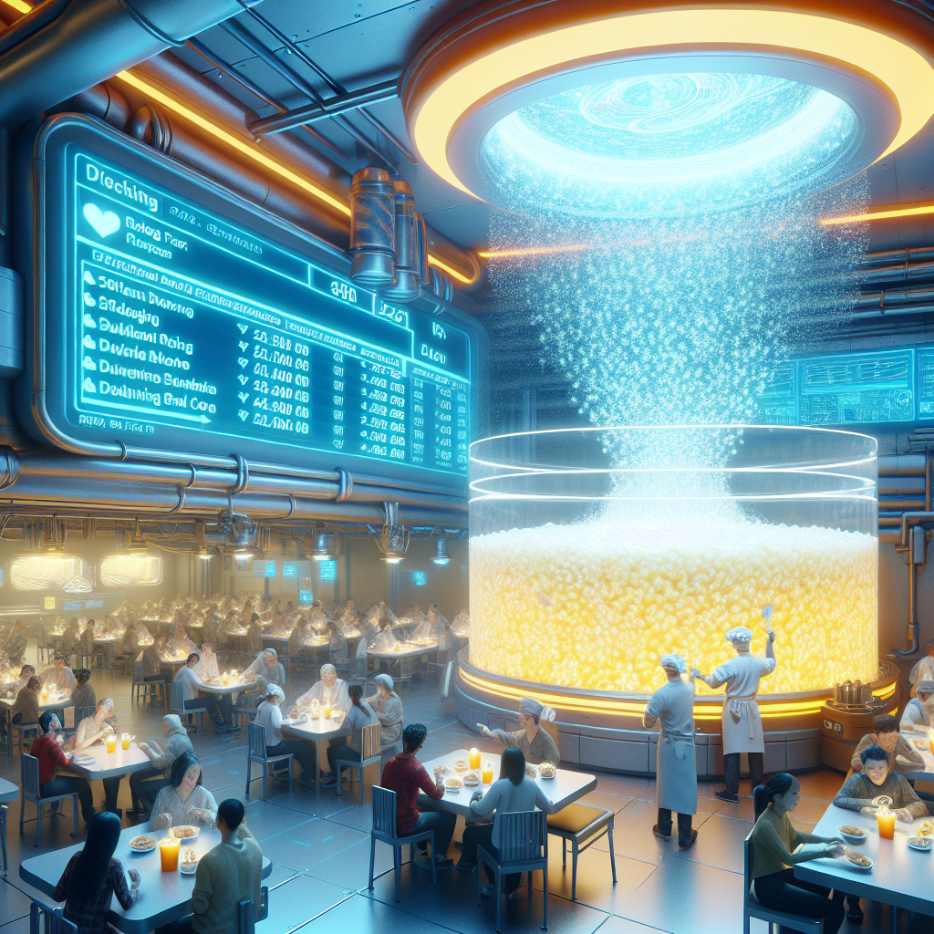 User prompt: Please respond with an image generation prompt that would be likely to create an interesting visual using DALLE-3, using the following style: [ Vaporwave ] and depicting this scene: In a bustling McDonald's restaurant, a warm, delicious scent of freshly baked biscuits fills the air. Customers happily bite into buttery, flaky biscuits, enjoying each mouthful. As they savor the rich taste of butter, the delighted expressions on their faces reflect satisfaction. Meanwhile, the stock ticker for McDonald's (MCD) cheerfully climbs upward, its green arrow pointing to new heights with each passing moment. The interplay of increasing butter consumption and McDonald's stock price creates a golden, buttery domino effect of success. Keep the visual depiction simple. Do not include any words or speech bubbles.