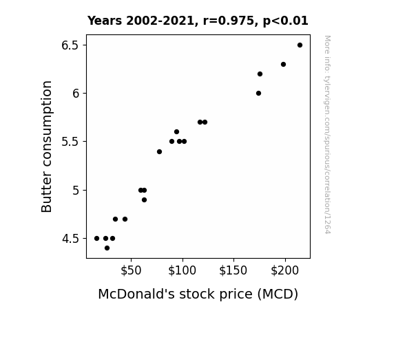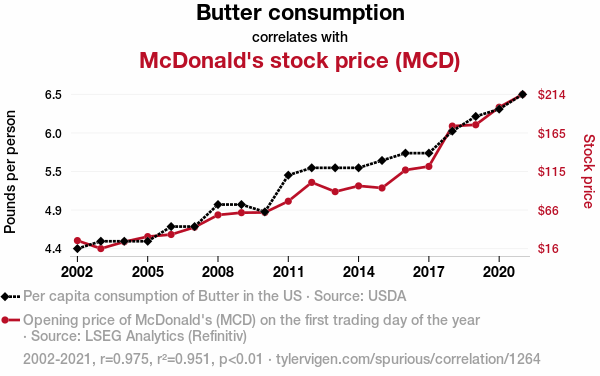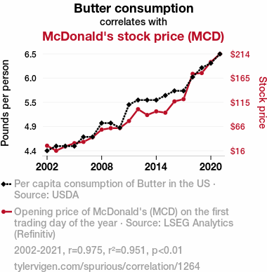 - The spurious research paper: Spreading the Wealth: A Butterly Connection Between Butter Consumption and McDonald's Stock Price