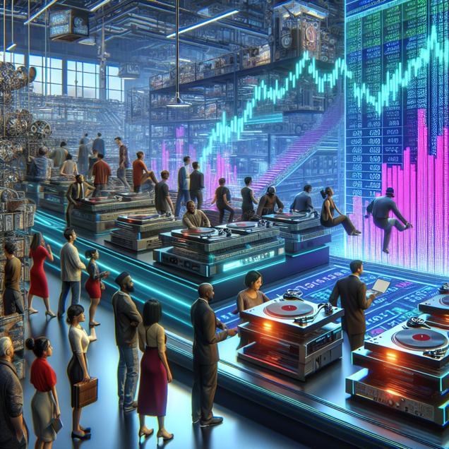 ChatGPT: Generate an image of a futuristic record store, where LP/vinyl albums are floating off the shelves and a line of people are waiting to purchase turntables. In the background, depict a factory assembly line rapidly producing electronic components for turntables. Transition the scene to a bustling stock exchange with traders discussing the rise in stock prices of the companies manufacturing electronic components. Finally, show a group of investors gathered around a screen displaying the soaring stock performance of technology companies, including Apple.