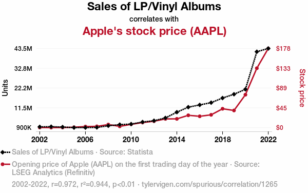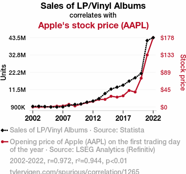 vinyl album sales, Apple stock price correlation, LP sales and stock market, music and investment correlation, audiophiles and investors, music industry and stock market, correlation coefficient, market data analysis, Statista data, LSEG Analytics, vinyl records investment potential