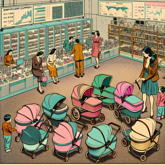 ChatGPT: Generate a scene that captures the bustling energy of a vintage comic-book-style baby store, with muted colors and a dotted halftone pattern. Illustrate the rows of colorful strollers and baby accessories, with eager parents browsing through the selection. The "Walker" stroller model should stand out as a focal point, drawing the attention of many customers. Show the store owner taking decisive action by placing a larger order for strollers with a semiconductor manufacturing equipment supplier, showcasing the surge in demand. Depict the supplier's warehouse filled with high-tech machinery, highlighting the intricate production process. In the background, feature investors discussing the company's impressive sales growth and future potential, with rising stock prices displayed on a digital ticker overhead. Create a rich, visually interesting comic-book-style illustration that brings this bustling and dynamic scene to life.