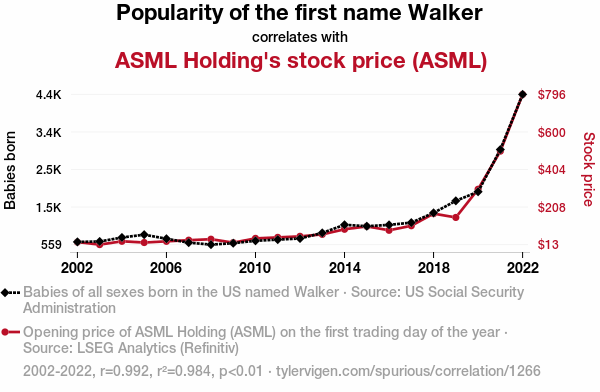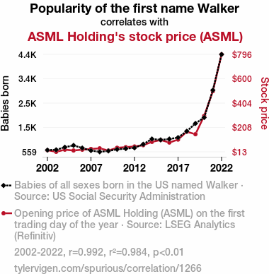User prompt: Please provide potential search keywords for a paper titled Walk-ing the Talk: A Punny Investigation into the Connection between the Popularity of the Name Walker and ASML Holding's Stock Price with an abstract of In this study, we investigate the curious relationship between the popularity of the name "Walker" and the stock price of ASML Holding. Utilizing data from the US Social Security Administration and LSEG Analytics (Refinitiv), we analyzed the correlation between the prevalence of the name "Walker" and the fluctuations in ASML Holding's stock price from 2002 to 2022. Our findings reveal a staggering correlation coefficient of 0.9918453 with p < 0.01, emphasizing a remarkably strong association between these seemingly unrelated variables.