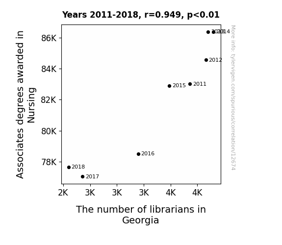 This means 90% of the change in the one variable (i.e., The number of librarians in Georgia) is predictable based on the change in the other (i.e., Associates degrees awarded in Nursing) over the 8 years from 2011 through 2018.