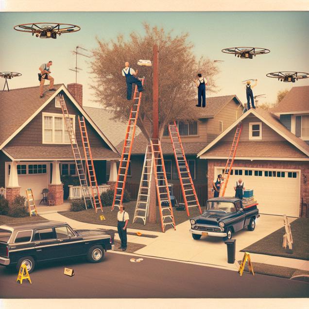 Prompt: Generate an image that showcases a suburban neighborhood scene captured in the style of a Polaroid photo. The image features households with new, taller ladders leaning against their garages, some propped up against trees to reach new heights. In the background, SBA Communications workers are seen using their equipment to retrieve frisbees and drones tangled in tree branches, triggered by the increased demand for their services due to the higher ladders. The depiction should include only scenes, people, and objects, it should not include text or speech bubbles.
