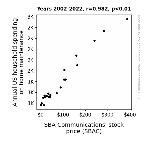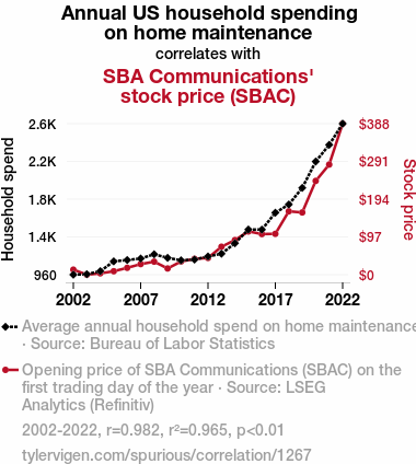 User prompt: Please provide potential search keywords for a paper titled Stocking Up: The Link Between Household Spending on Home Maintenance and SBAC Stock Price with an abstract of This study examines the intriguing relationship between annual US household spending on home maintenance and the stock price of SBA Communications (SBAC). Using comprehensive data from the Bureau of Labor Statistics and LSEG Analytics (Refinitiv) spanning the years 2002 to 2022, our research team unveils a correlation coefficient of 0.9822853 with a p-value less than 0.01, highlighting a remarkably strong association between these two seemingly unrelated variables.