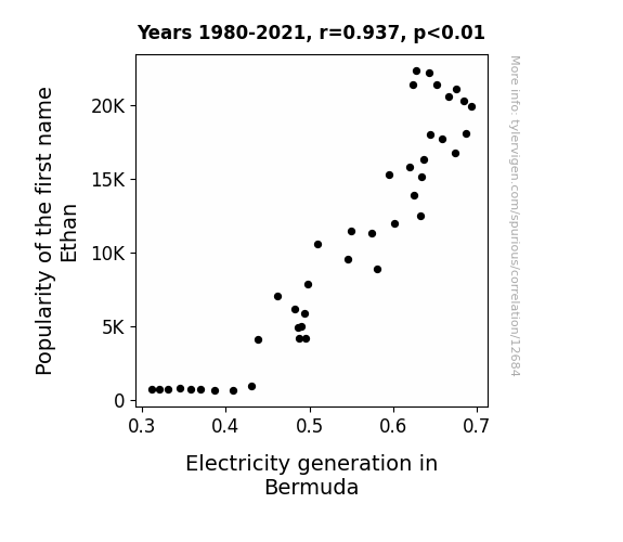 This means 87.8% of the change in the one variable (i.e., Electricity generation in Bermuda) is predictable based on the change in the other (i.e., Popularity of the first name Ethan) over the 42 years from 1980 through 2021.