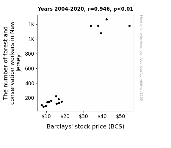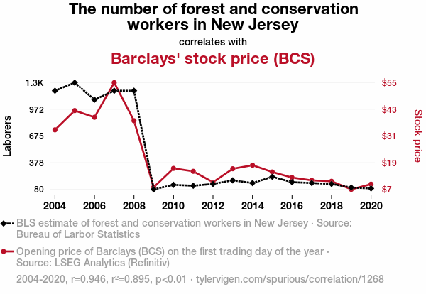 This means 89.5% of the change in the one variable (i.e., Barclays' stock price (BCS)) is predictable based on the change in the other (i.e., The number of forest and conservation workers in New Jersey) over the 17 years from 2004 through 2020.