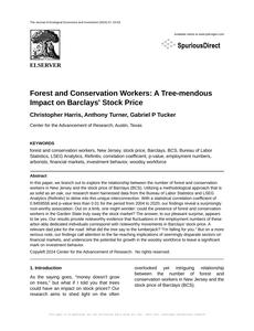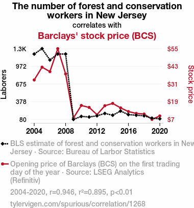 User prompt: Please provide potential search keywords for a paper titled Forest and Conservation Workers: A Tree-mendous Impact on Barclays' Stock Price with an abstract of In this paper, we branch out to explore the relationship between the number of forest and conservation workers in New Jersey and the stock price of Barclays (BCS). Utilizing a methodological approach that is as solid as an oak, our research team harnessed data from the Bureau of Labor Statistics and LSEG Analytics (Refinitiv) to delve into this unique interconnection. With a statistical correlation coefficient of 0.9459558 and p-value less than 0.01 for the period from 2004 to 2020, our findings reveal a surprisingly root-worthy association.