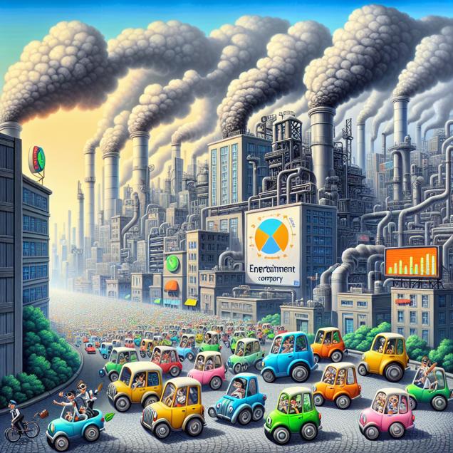 ChatGPT: In a bustling city, a line of colorful, cartoonish cars resembling the Flintstones' iconic foot-powered vehicle can be seen on the street, with smiling people happily pushing them along. Meanwhile, just beyond the city, a massive oil refinery is seen, with smoke billowing from its tall chimneys, indicating high levels of petroleum consumption. In the background, a digital stock ticker display shows the stock price of Warner Bros. Discovery rapidly climbing in response to the surge in foot-powered car adoption.