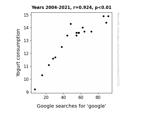 This means 85.4% of the change in the one variable (i.e., Google searches for 'google') is predictable based on the change in the other (i.e., Yogurt consumption) over the 18 years from 2004 through 2021.
