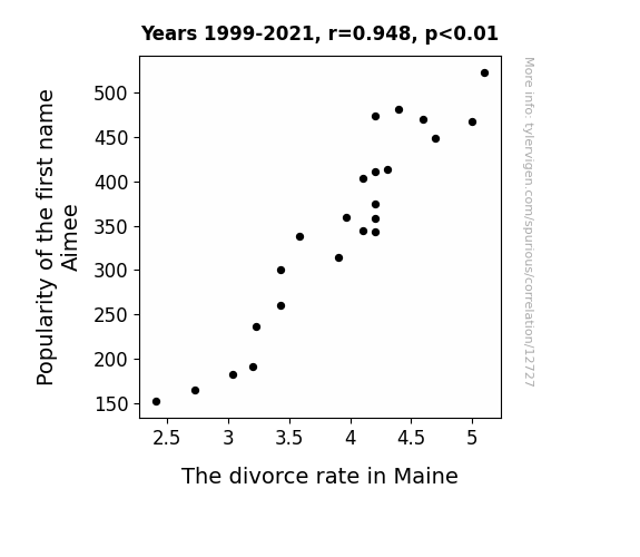 This means 89.8% of the change in the one variable (i.e., The divorce rate in Maine) is predictable based on the change in the other (i.e., Popularity of the first name Aimee) over the 23 years from 1999 through 2021.