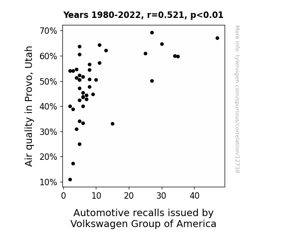 This means 27.2% of the change in the one variable (i.e., Automotive recalls issued by Volkswagen Group of America) is predictable based on the change in the other (i.e., Air quality in Provo, Utah) over the 43 years from 1980 through 2022.