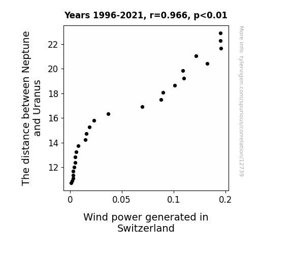 This means 93.4% of the change in the one variable (i.e., Wind power generated in Switzerland) is predictable based on the change in the other (i.e., The distance between Neptune and Uranus) over the 26 years from 1996 through 2021.