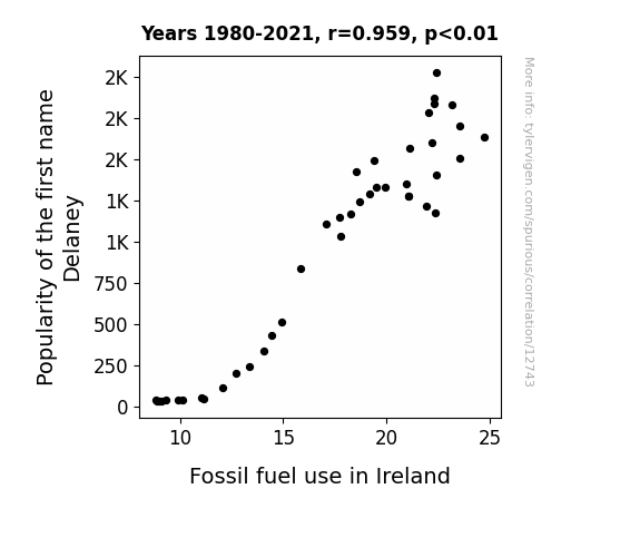 This means 91.9% of the change in the one variable (i.e., Fossil fuel use in Ireland) is predictable based on the change in the other (i.e., Popularity of the first name Delaney) over the 42 years from 1980 through 2021.