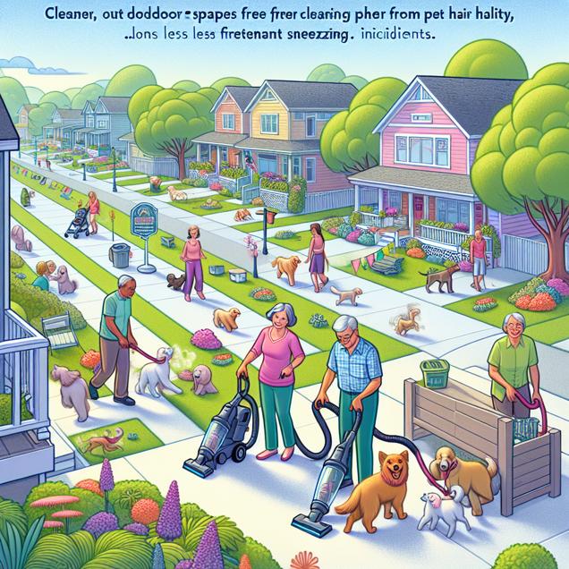 ChatGPT: Generate an image that depicts a serene, suburban street with beautifully maintained houses and vibrant gardens. Show people enthusiastically vacuuming pet hair off their porches and lawns, leading to cleaner, pet hair-free outdoor spaces. Capture the improved air quality and fewer sneezing fits as a result of this community-driven effort. Additionally, illustrate more families walking their pets around the neighborhood and an increase in pet adoptions from the local shelter. Visualize the subsequent influx of people visiting the nearby IDEXX Laboratories, possibly alluding to the soaring stock price. Keep the scene visually straightforward, ensuring a clear focus on the positive transformation brought about by the community's actions.