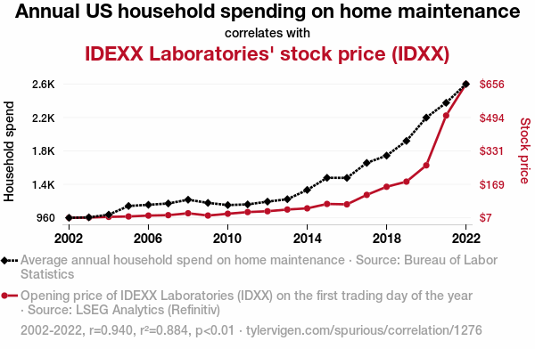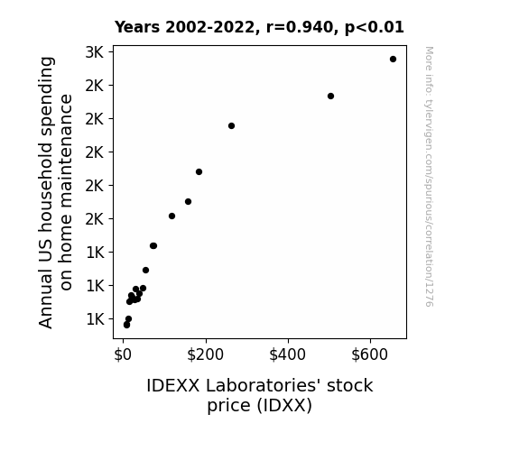User prompt: Please provide potential search keywords for a paper titled The Paw-sitively Purrfect Pair: Exploring the Feline Connection Between Annual US Household Spending on Home Maintenance and IDEXX Laboratories' Stock Price with an abstract of This paper delves into the captivating correlation between the annual US household spending on home maintenance and the stock price of IDEXX Laboratories (IDXX). Utilizing data from the Bureau of Labor Statistics and LSEG Analytics (Refinitiv), our research team uncovered a significant correlation coefficient of 0.9402224 with a p-value of less than 0.01 for the period spanning from 2002 to 2022. The findings of this study shed light on the fascinating interplay between the domestic economy and the financial market, revealing a purrfectly interesting connection that may not be fully littered with causation, but certainly raises eyebrows--and tails.