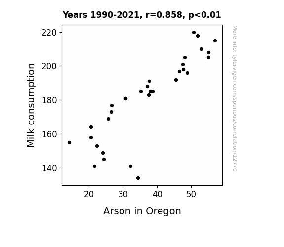 This means 73.6% of the change in the one variable (i.e., Arson in Oregon) is predictable based on the change in the other (i.e., Milk consumption) over the 32 years from 1990 through 2021.