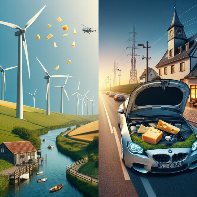 Prompt: Prompt: Generate an image that encapsulates the serene landscape of Luxembourg, with elegant wind turbines spinning in the distance. As the wind power intensifies, it lifts delicate particles of cheese into the air, creating an ethereal atmosphere. Meanwhile, in the USA, visualize the hoods of Mercedes-Benz cars accumulating an unusual amount of gouda cheese in their engine compartments, leading to perplexed and frustrated car owners. The scene should capture the juxtaposition of nature's influence and technological confusion. The depiction should include only scenes, people, and objects, it should not include text or speech bubbles.