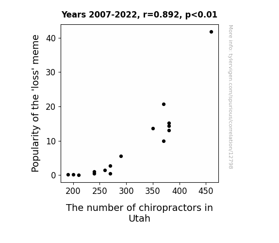 This means 79.5% of the change in the one variable (i.e., The number of chiropractors in Utah) is predictable based on the change in the other (i.e., Popularity of the 'loss' meme) over the 16 years from 2007 through 2022.