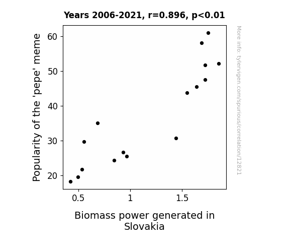 This means 80.3% of the change in the one variable (i.e., Biomass power generated in Slovakia) is predictable based on the change in the other (i.e., Popularity of the 'pepe' meme) over the 16 years from 2006 through 2021.