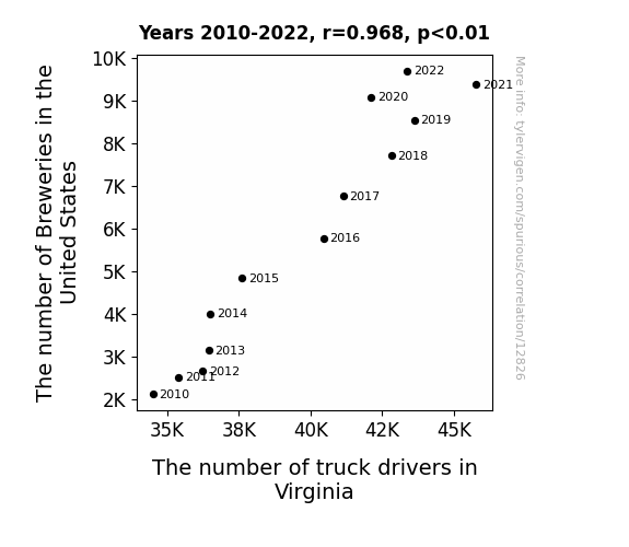 This means 93.7% of the change in the one variable (i.e., The number of truck drivers in Virginia) is predictable based on the change in the other (i.e., The number of Breweries in the United States) over the 13 years from 2010 through 2022.