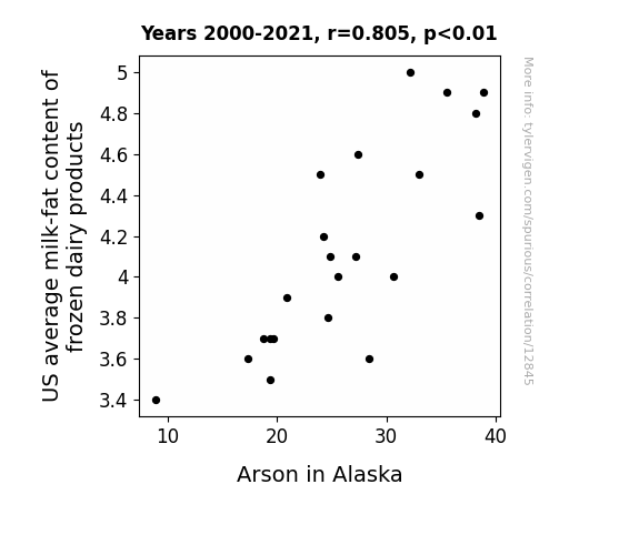 This means 64.9% of the change in the one variable (i.e., Arson in Alaska) is predictable based on the change in the other (i.e., US average milk-fat content of frozen dairy products) over the 22 years from 2000 through 2021.