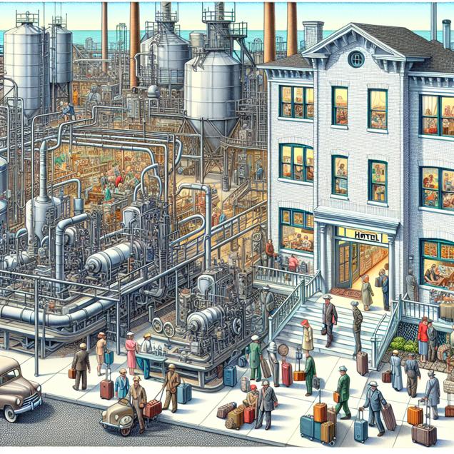 ChatGPT: Generate an image of a small industrial town in Massachusetts, with a row of idle chemical equipment in the foreground. Fewer workers are seen tending to the machines. Alongside the industrial setting, depict a local hotel with a steady stream of travelers entering, their suitcases thumping against the polished floor. The hotel lobby should be depicted as bustling with activity, showing guests seeking respite in the comfortable rooms, drawn by the promise of adventure and new beginnings. The entire scene should be depicted in a cute art illustration style, with attention to small details and vibrant colors.