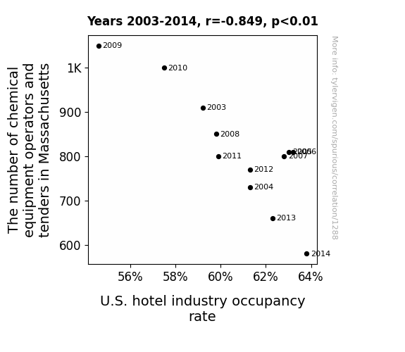 User prompt: Please provide potential search keywords for a paper titled The Chemical Conundrum: An Examination of the Correlation Between Chemical Equipment Operators and Tenders in Massachusetts and U.S. Hotel Industry Occupancy Rates with an abstract of In this study, we delve into the curious relationship between the number of chemical equipment operators and tenders in the state of Massachusetts and the occupancy rates of the U.S. hotel industry. Utilizing data from the Bureau of Labor Statistics and Statista, we unravel the statistical intricacies that intertwine these seemingly disparate elements. Our analysis reveals a noteworthy correlation coefficient of -0.8487466 and p < 0.01 for the years spanning 2003 to 2014, shedding light on the intricate dance between chemical equipment operations and hotel accommodation tendencies. Join us as we uncover the unsuspected interplay between these industries, proving that even in the most unexpected places, the chemicals concoct an intriguing tale.
