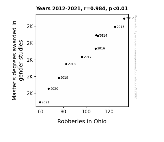 This means 96.9% of the change in the one variable (i.e., Robberies in Ohio) is predictable based on the change in the other (i.e., Master's degrees awarded in gender studies) over the 10 years from 2012 through 2021.