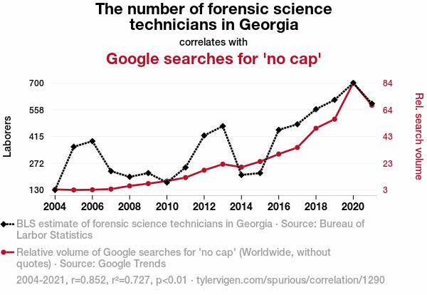 - The spurious research paper: No Cap: Exploring the Correlation Between the Number of Forensic Science Technicians in Georgia and Google Searches for 'No Cap'
