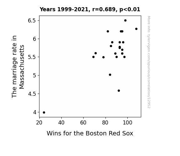 This means 47.5% of the change in the one variable (i.e., Wins for the Boston Red Sox) is predictable based on the change in the other (i.e., The marriage rate in Massachusetts) over the 23 years from 1999 through 2021.