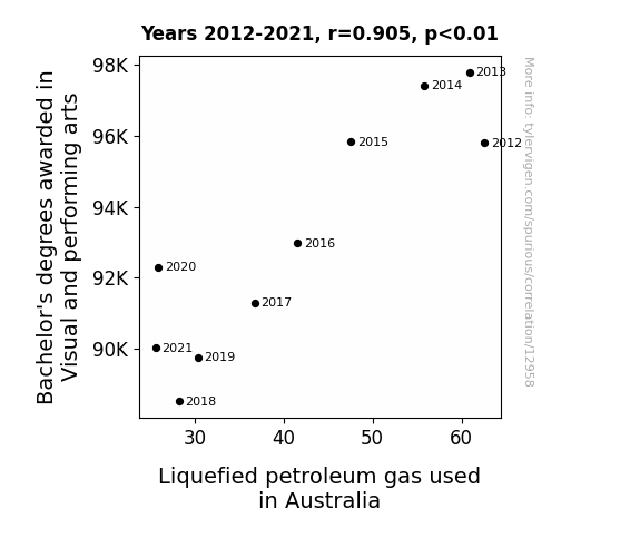 This means 81.9% of the change in the one variable (i.e., Liquefied petroleum gas used in Australia) is predictable based on the change in the other (i.e., Bachelor's degrees awarded in Visual and performing arts) over the 10 years from 2012 through 2021.
