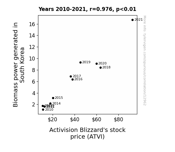 This means 95.2% of the change in the one variable (i.e., Activision Blizzard's stock price (ATVI)) is predictable based on the change in the other (i.e., Biomass power generated in South Korea) over the 12 years from 2010 through 2021.