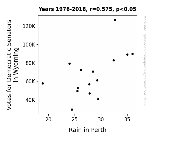 This means 33% of the change in the one variable (i.e., Rain in Perth) is predictable based on the change in the other (i.e., Votes for Democratic Senators in Wyoming) over the 15 years from 1976 through 2018.