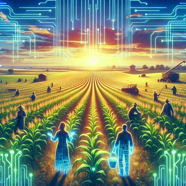 Prompt: Generate an image that blends cybernetic art with a peaceful, rural scene in Iowa. A serene landscape unfolds, with vast, non-GMO cornfields stretching far into the distance. In this cybernetic interpretation, the corn stalks shimmer with a subtle, digital glow, creating an otherworldly yet tranquil atmosphere. Farmers diligently tend to the crops, their forms infused with faint pixelation, blending the natural and the digital seamlessly. Above, the sky exudes a calming, neon hue, casting a cybernetic glow over the entire scene. People congregate, engaged in serene conversation, their silhouettes adorned with intricate, circuit-like patterns that evoke a futuristic tranquility. This image invites viewers into a harmonious, cybernetic interpretation of rural serenity, offering a glimpse of a peaceful existence amidst the ever-evolving intersection of technology and nature. The depiction should include only scenes, people, and objects, it should not include text or speech bubbles.