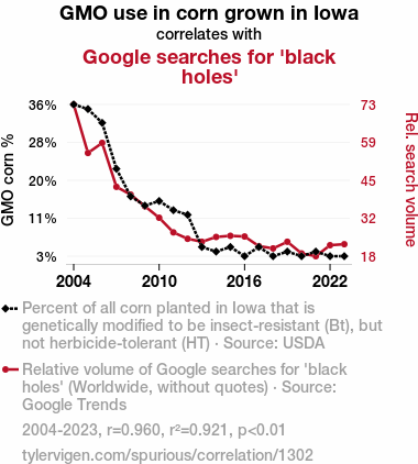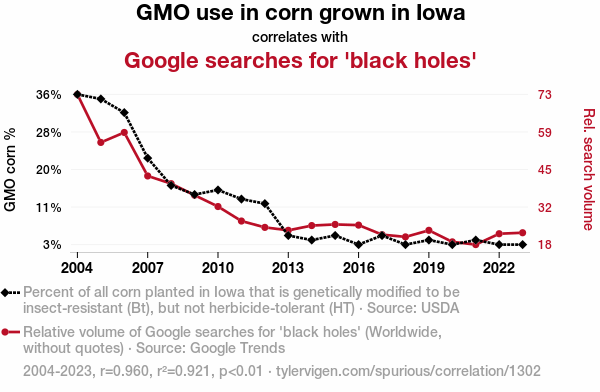 This means 92.1% of the change in the one variable (i.e., Google searches for 'black holes') is predictable based on the change in the other (i.e., GMO use in corn grown in Iowa) over the 20 years from 2004 through 2023.
