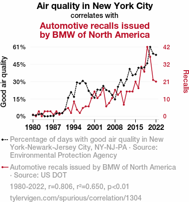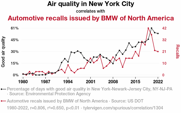 This means 65% of the change in the one variable (i.e., Automotive recalls issued by BMW of North America) is predictable based on the change in the other (i.e., Air quality in New York City) over the 43 years from 1980 through 2022.