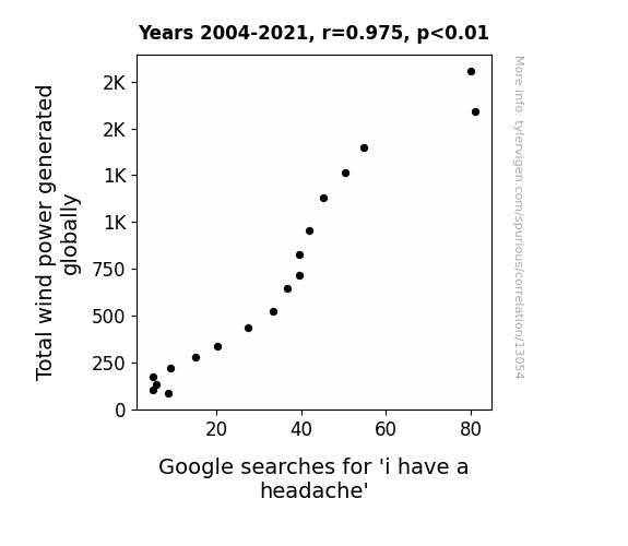 This means 95% of the change in the one variable (i.e., Google searches for 'i have a headache') is predictable based on the change in the other (i.e., Total wind power generated globally) over the 18 years from 2004 through 2021.
