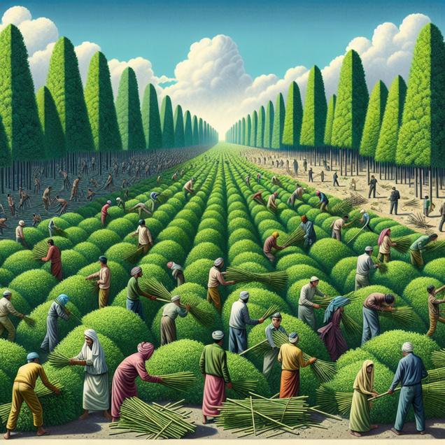 Prompt: Generate an image of an idyllic forest filled with vibrant green sagebrush plants under a clear blue sky. Then, depict the scene with workers rapidly chopping down the sagebrush, creating a pile of smudge sticks to meet high demand. Show the landscape depleted, with reduced oxygen production evident in the slightly hazy air. Emphasize the stark contrast between the lush, flourishing forest and the barren, depleted aftermath. Use a Brutalist style to convey the harsh impact of human activity on nature. The depiction should include only scenes, people, and objects, it should not include text or speech bubbles.