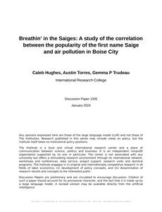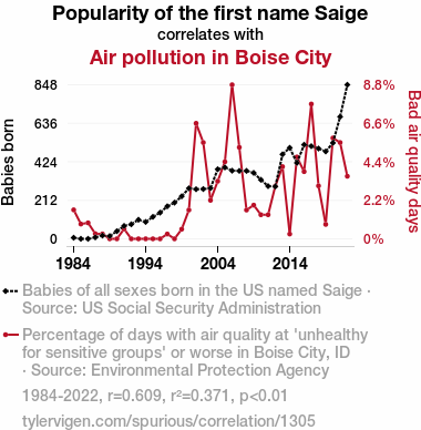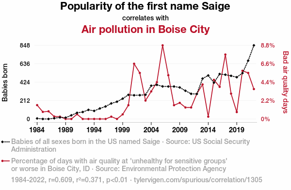 "Saige name popularity," "air pollution Boise City," "correlation study," "US Social Security Administration data," "Environmental Protection Agency air quality data," "relationship between name popularity and air pollution," "correlation coefficient significance," "air pollution analysis," "Saige name trend," "air quality impact on naming trends"