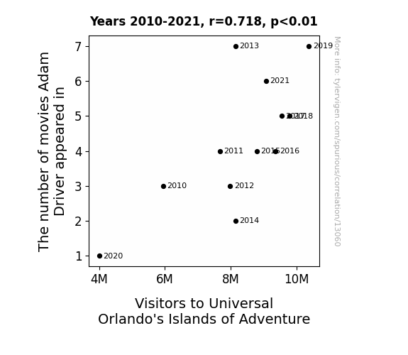 This means 51.6% of the change in the one variable (i.e., Visitors to Universal Orlando's Islands of Adventure) is predictable based on the change in the other (i.e., The number of movies Adam Driver appeared in) over the 12 years from 2010 through 2021.