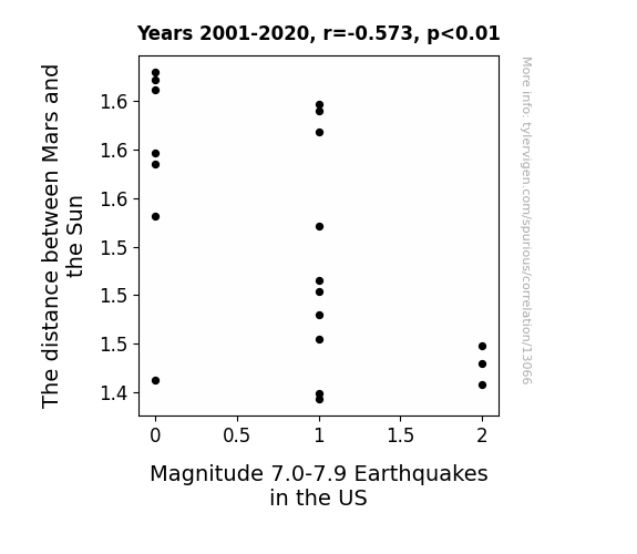 This means 32.9% of the change in the one variable (i.e., Magnitude 7.0-7.9 Earthquakes in the US) is predictable based on the change in the other (i.e., The distance between Mars and the Sun) over the 20 years from 2001 through 2020.