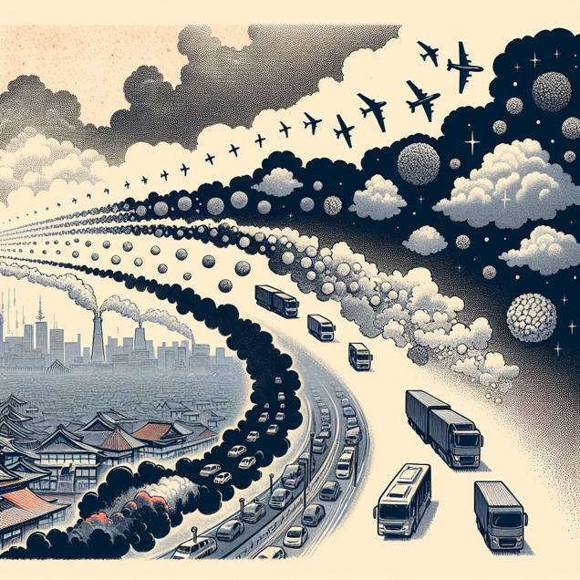 ChatGPT: Generate an image of smog particles floating in the air in Jackson, slowly dissipating as the air quality improves. Show the particles beginning to pack their bags and depart for Portugal, with a sense of movement and transition. Then, depict the smog particles arriving in Portugal and encountering kerosene, hinting at a brief interaction before they swiftly leave. Finally, visualize the smog particles leaving Portugal, portraying a decrease in kerosene usage and a sense of progress. Use woodblock painting style to emphasize the transitions and movements in the scenes.