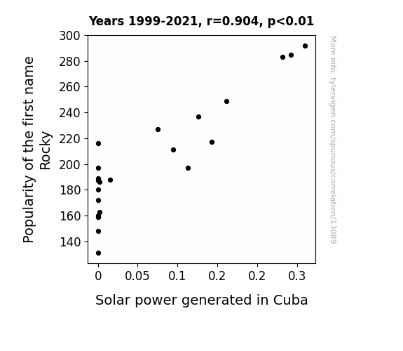 This means 81.8% of the change in the one variable (i.e., Solar power generated in Cuba) is predictable based on the change in the other (i.e., Popularity of the first name Rocky) over the 23 years from 1999 through 2021.