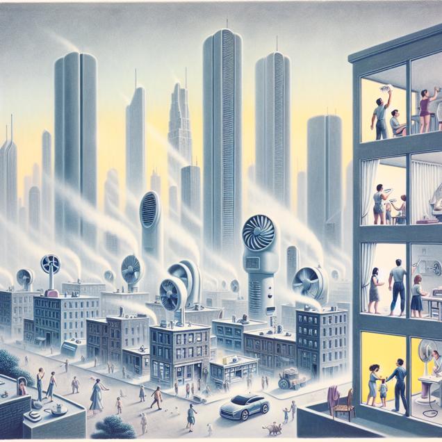 User prompt: Please respond with an image generation prompt that would be likely to create an interesting visual using DALLE-3, using the following style: [ High-tech ] and depicting this scene: In the scene, we see the city of Watertown, New York with haze hanging in the air. There are people outside their homes, waving their hands and fanning the air to clear out the pollution. Inside the homes, windows are open with fans blowing, and residents are seen wiping surfaces clean. In the background, a few people are seen holding their phones, but instead of searching for "Snoop Dog," they are busy attending to their homes, indicating a decrease in online searches for the artist. Keep the visual depiction simple. Do not include any words or speech bubbles.