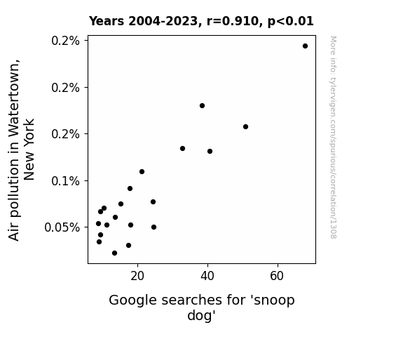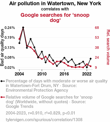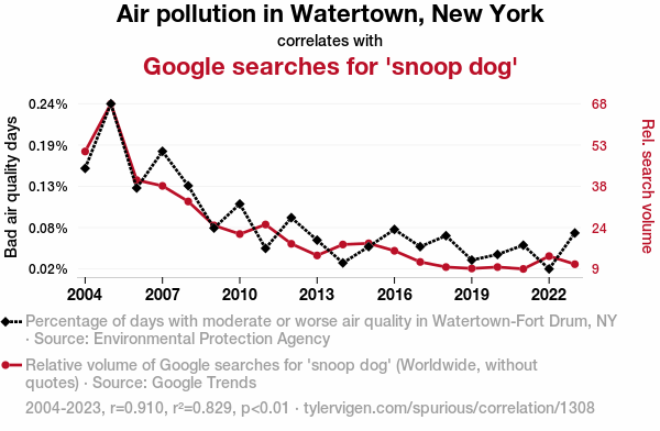 - The spurious research paper: Snoop Dogg and Smog: An Analysis of Air Pollution in Watertown, New York and Its Impact on Google Searches