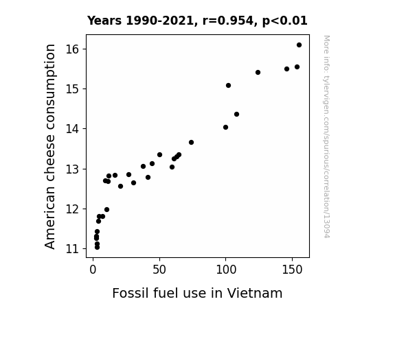 This means 91% of the change in the one variable (i.e., Fossil fuel use in Vietnam) is predictable based on the change in the other (i.e., American cheese consumption) over the 32 years from 1990 through 2021.