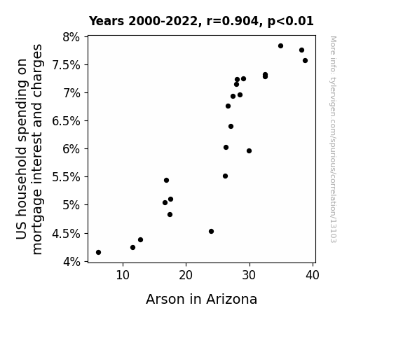 This means 81.7% of the change in the one variable (i.e., Arson in Arizona) is predictable based on the change in the other (i.e., US household spending on mortgage interest and charges) over the 23 years from 2000 through 2022.