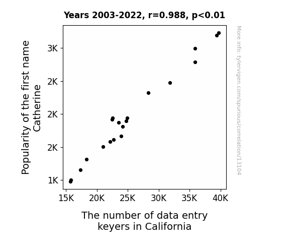 This means 97.6% of the change in the one variable (i.e., The number of data entry keyers in California) is predictable based on the change in the other (i.e., Popularity of the first name Catherine) over the 20 years from 2003 through 2022.